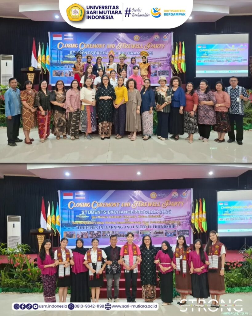 Prof. Dr. Dra. Ivan Elisabeth Purba, SH, M.Kes dalam sambutannya menyampaikan kehadiran peserta student exchange dari Thailand memberikan warna baru bagi USM-Indonesia,” Your presence has made our university more colorful and more global. We have learned from one another, grown together, and built friendships that go beyond borders. This is something we will always treasure”, tuturnya.