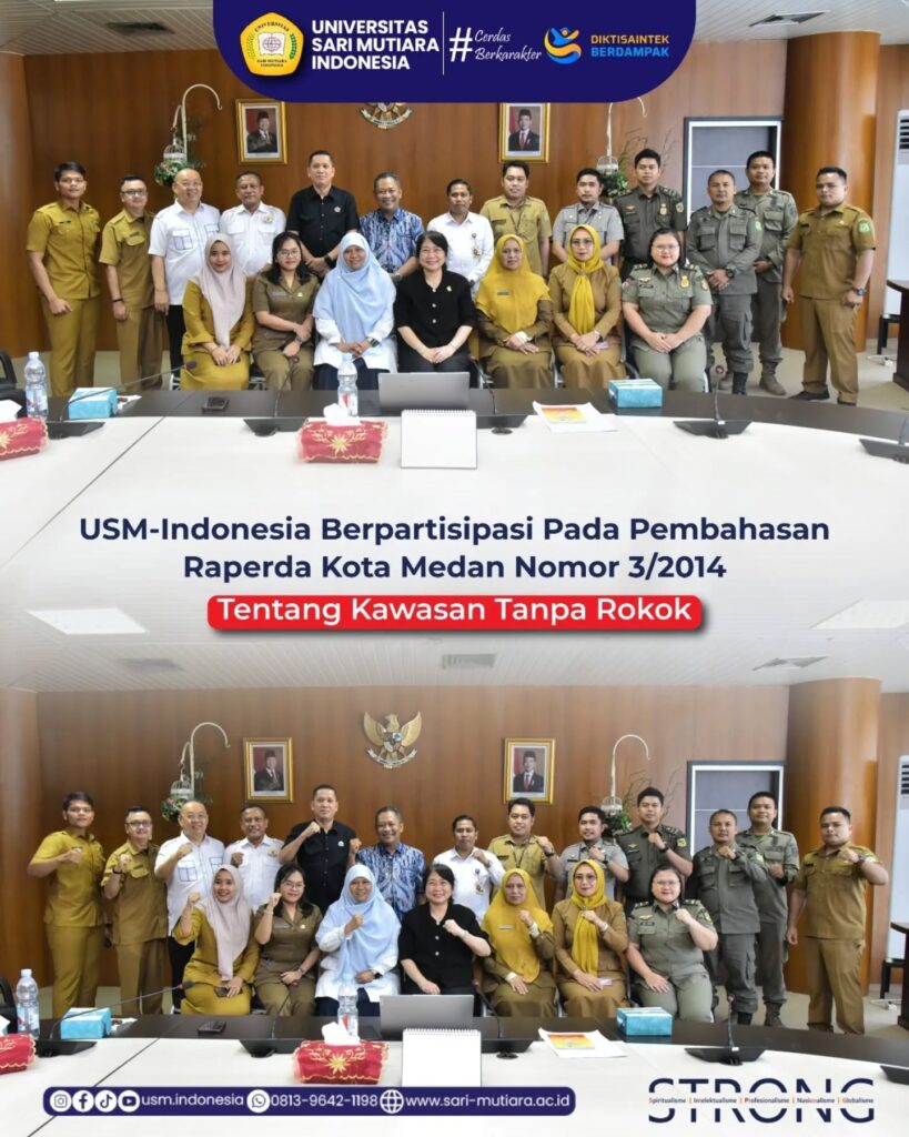 USM-Indonesia | Universitas Sari Mutiara Indonesia (USM-Indonesia) menghadiri undangan Panitia Khusus (Pansus) DPRD Kota Medan menggelar Rapat Pembahasan Raperda Kota Medan tentang Perubahan atas Perda Kota Medan Nomor 3 Tahun 2014 tentang Kawasan Tanpa Rokok (KTR), yang berlangsung di Ruang Rapat Badan Musyawarah DPRD Kota Medan, Senin (06/10/2025).