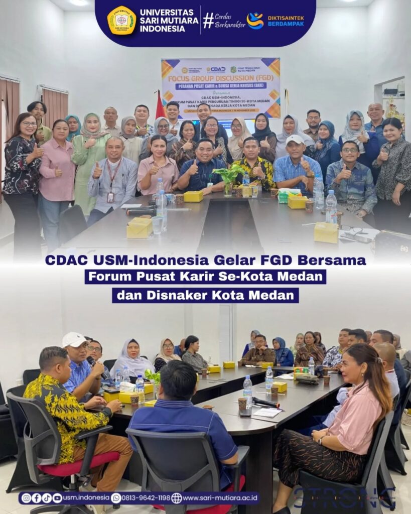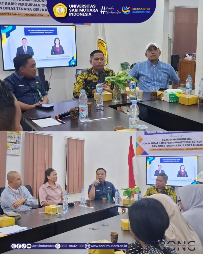 USM-Indonesia | Career Development & Alumni Centre Universitas Sari Mutiara Indonesia sukses menyelenggarakan Focus Group Discussion (FGD) dengan tema “Peranan Pusat Karir & Bursa Kerja Khusus (BKK) bersama Forum Pusat Karir Se-Kota Medan dan Disnaker Kota Medan di Meeting Room Wakil Rektor III USM-Indonesia, Selasa 18/11/2025.