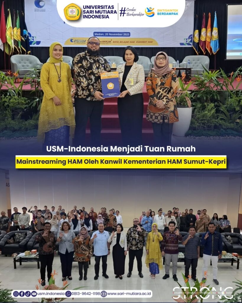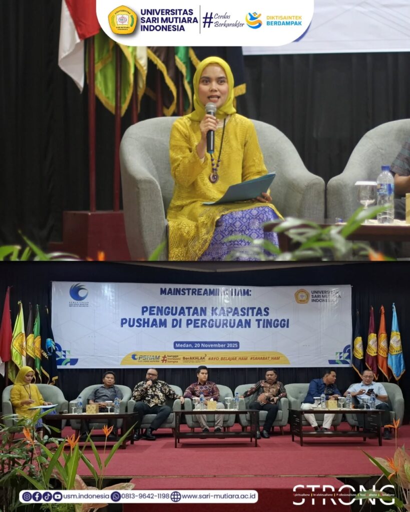 USM-Indonesia | Universitas Sari Mutiara Indonesia bekerjasama dengan Kanwil Kemen HAM Sumut-Kepri melaksanakan kegiatan Mainstreaming HAM bertema “Penguatan Kapasitas Pusham Di Perguruan Tinggi”, yang dilaksanakan di Ign. Washington Purba Hall, Kamis (20/11/2025).